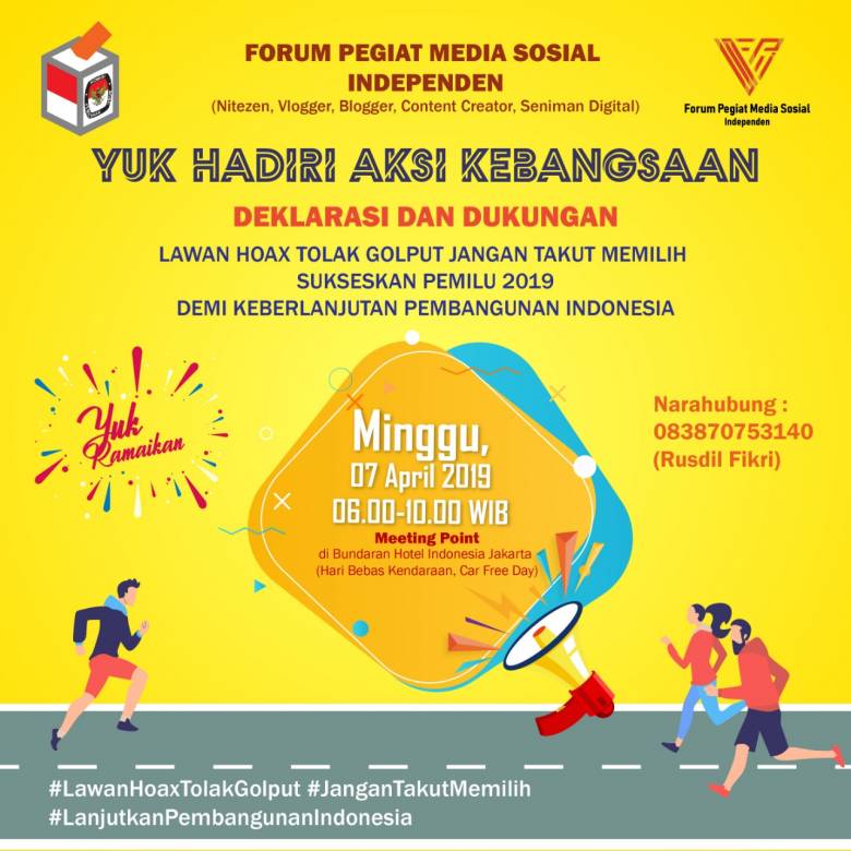 FPMSI akan menggelar deklarasi dan aksi kebangsaan di area Car Free Day (CFD) tepatnya di sekitaran Bundaran Hotel Indonesia, Jakarta Pusat, Minggu (7/4/2019) pagi. Untuk kesekian kalinya FPMSI melaksanakan gerakan literasi dalam rangka dukungan melawan hoax dan menolak Golput serta Ajakan untuk Jangan Takut Memilih pada Pemilu 2019 17 April nanti.