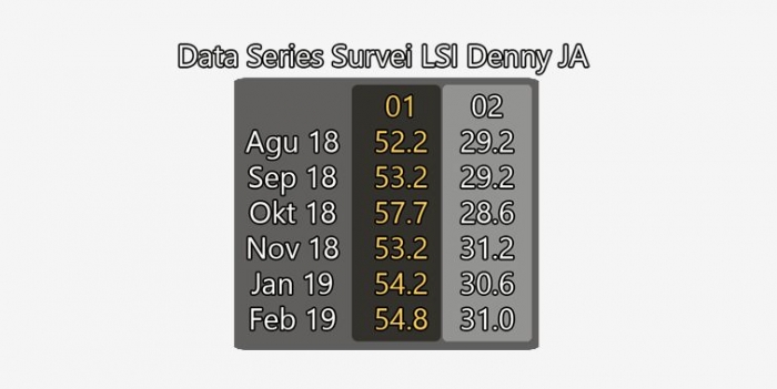 ngkan misalnya dengan survei yang dilakukan LSI Denny JA. Berbeda dengan metode Polmark, Denny JA melakukan survei setiap bulan sepanjang Agustus 2018 hingga Januari 2019. Berdasarkan survei tersebut, terlihat dinamika elektabilitas pasangan Jokowi-Amin dan Prabowo-Sandi seperti dalam tabel berikut: