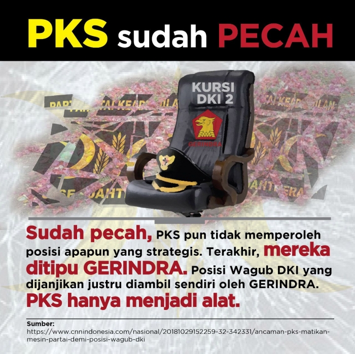 Perseteruan antara Partai Keadilan Sejahtera (PKS) dan Partai Gerindra (Gerindra) mengenai siapa yang akan menempati posisi Wakil Gubernur DKI Jakarta yang ditinggalkan Sandiaga Uno, belum juga menemui titik terang. Bahkan, Ketua Umum Partai Gerindra Prabowo Subianto justru membuat situasinya semakin gelap. Pasalnya, Prabowo Subianto justru menyerahkan persoalan kursi wagub DKI itu kepada Ketua DPD Gerindra DKI Jakarta Mohamad Taufik.