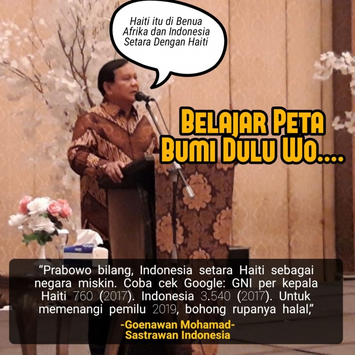 Belum lagi menyoal data. Janganakan pengetahuan geografi menyangkut letak Haiti yang disebutnya masuk wilayah Afrika, padahal jelas-jelas secara detail Haiti berada di Kepulauan Karibia. Letaknya di bagian utara Kolombia, masuk menjadi negara bagian Amerika Selatan. Belum lagi menyoal kondisi perekonomian yang dibandingkan dengan Indonesia yang konon setingkat kemiskinannya.